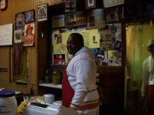The room is small and close and full of festive, frayed history---plus a bunch of eager customers. I tell Sam he looks way too young to have been standing there carving pieces of hog and beef heaven for thirty years, as he claims. But sure enough, Sam started working for his uncle in 1978, at the age of 25, and took over the place for himself in ’98. At the beginning, Sam’s mom did all the cooking (“Used to be, he couldn’t even boil water,” she tells me), but these days she cares for Sam’s invalid sister pretty much full time. Tonight, to get a break from that all-consuming work, she’s dropped in to watch her handsome son work the counter, so I get to meet her. She's draped on the chair like her bones have turned to dust—she’s that tired. When we make our way up to the ordering station, my usual good fortune takes a holiday: Sam is out of ribs. There was more than one reason we shoulda been here earlier.