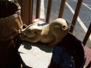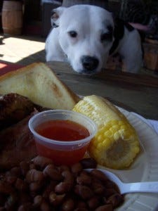Cripple Creek BBQ is easy to find and a haven for the weary driver. I have not yet settled into the sweet rhythm of driving; I still find myself yawning and keeping an obsessive eye on the mile-counter. An adjustment like this takes time. Perhaps by tomorrow I will get my groove on. This stand-alone rather cutesy building sports both a drive-through window and a pation complete with Adirondack chairs and a pig fountain. And sure, I can sit outside with Stella, allows the nice gray-haired lady who bears an uncanny resemblance to my second-grade teacher Mrs Rocks. Not only is it ok to have Stella at my feet during my hog-wing introduction, I proceed to receive a visit from every single one of the eight employees, who all want to meet her, and soon end up rubbing her belly. From the dishwasher to the servers to the window-man and, several times and with stories of her own dog, Mrs. Rocks. The pit-master breaks my heart. As he looks at Stella, his eyes glaze over a little. His beloved Eatey (she ate a lot) was stolen, crate and all, out of the back of his truck. No, he hasn’t had another dog since. I’ve heard people say this before, but not usually someone in his age group (40-50). The anticipation of possible heartbreak is so dreadful that they forego the sweet companionship of an animal.