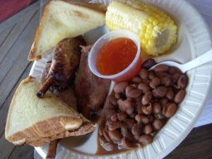But, I digress. (Or, is it dogress?) “I’m here to try the hog wings,” I tell the pretty blond server. “What would y’all lahk on the sahd?” she asks me, and I go for Texas beans and corn. De rigeur, certainly, is a Dr Pepper. “What exactly is a hog wing?” I ask when Julie comes back with by tall Styrofoam cup. She indicates her upper arm. “It’s the bone above the shank,” she explains. There are three wings on my elegantly partitioned plate, and I first devour the corn and (very nice) beans before beginning my investigation. The first thing to hit me is the smoke. This is not a subtle perfume. In size and dimension, the wing resembles a chocolate popsickle from the back of the ice cream truck that used to roam Brentwood when I was a kid (the last time I ate a popsickle). When I chomp in, the meat comes away easily in long moist flakes, and it is red, almost as though it’s been corned. This wing is quite tasty, but the smoke thing is so intense that I ask Julie to wrap my remaining two wings for the road. With an extra little cup of coleslaw, this will make a very nice supper when I hunker down in Shreveport for the night. Everyone comes out to wave as I trundle off in the over-laden Toyota. There is more pork on my horizon; I must set a pace. (I must also eat some salad.)